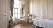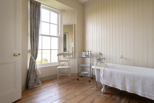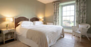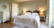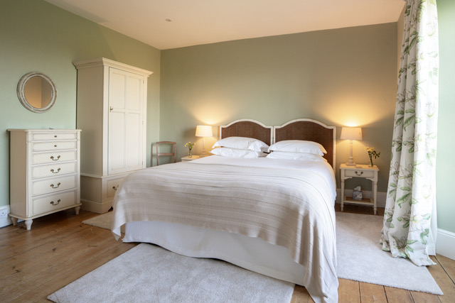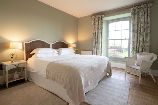 A large country-house room with gorgeous views over the garden and farmland beyond. It features a superkingsized bed with a White Company Duvet, wardrobe, dressing mirror and ensuite bathroom with luxurious enamel free-standing roll-top bath, a basin and toilet.