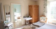 It has its own tea and coffee making facility with Jill’s homemade shortbread and bottled tap water. There’s a hair drier and a wicker armchair